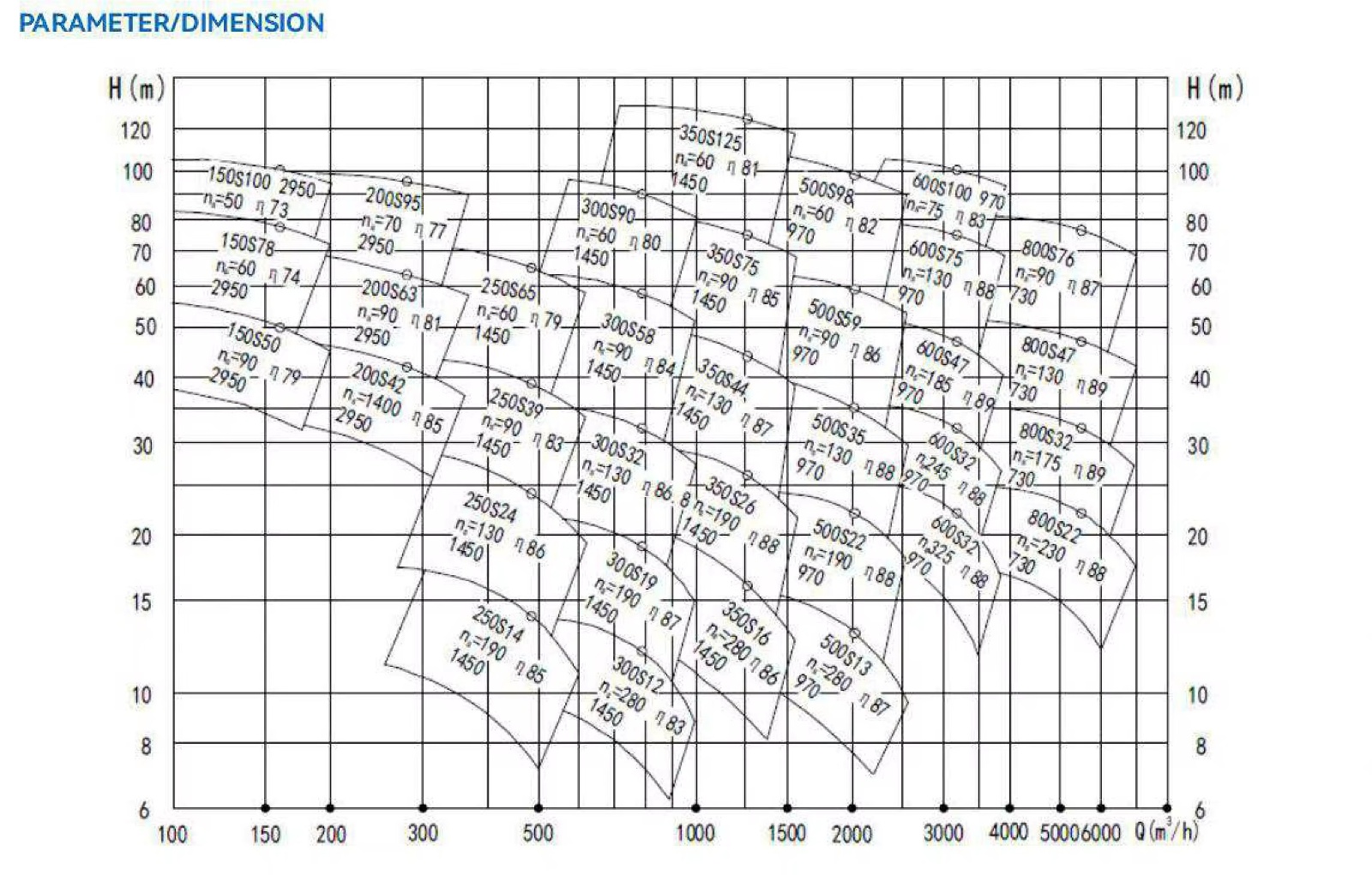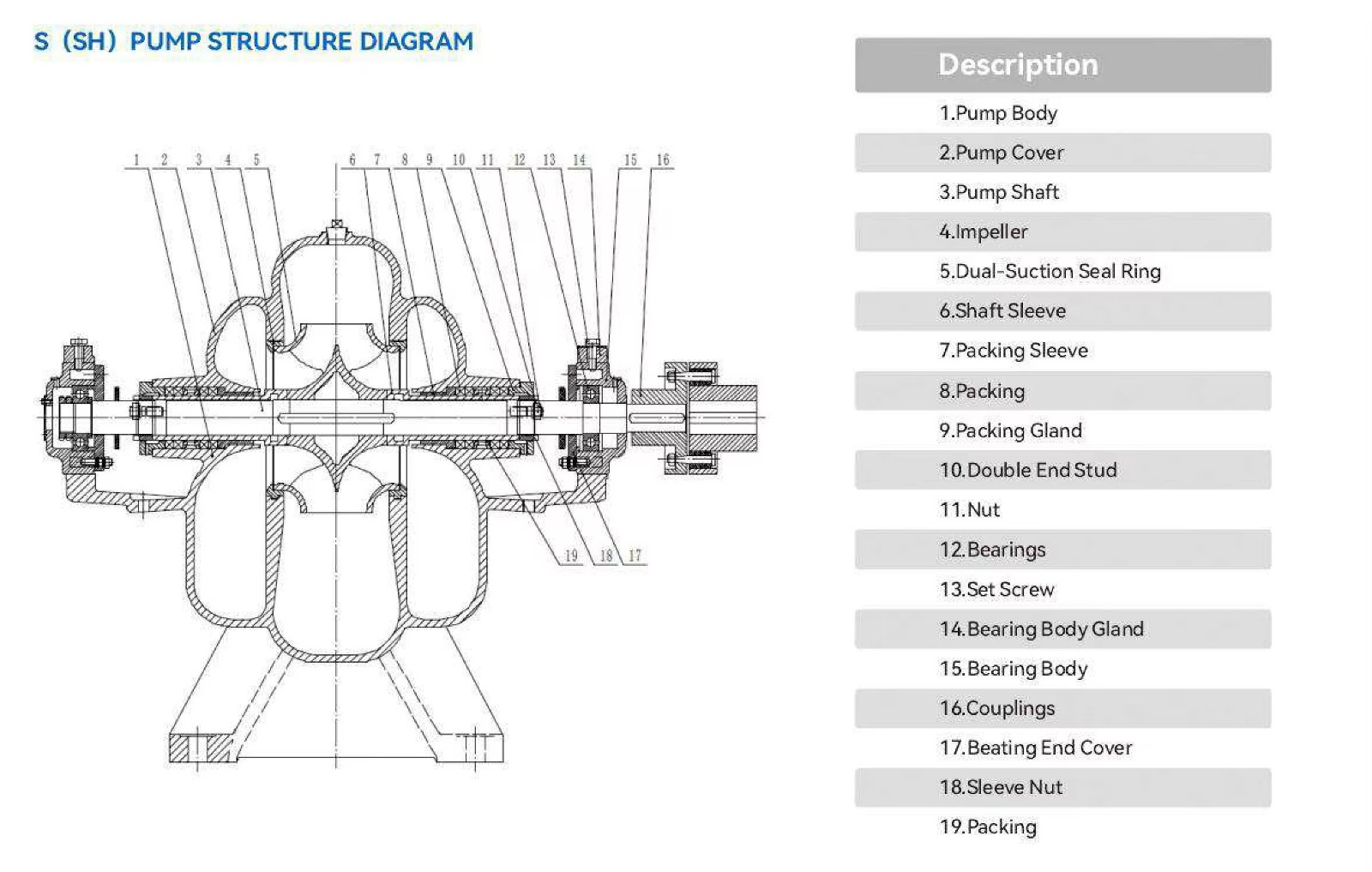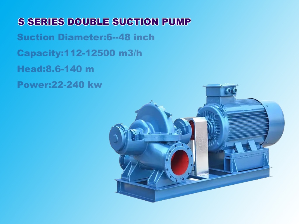 S-type single-stage double-suction centrifugal pump. Used for conveying clean water and liquids with physico chemical properties similar to water. The maximum temperature of the liquid should not exceed 80°C. It is suitable for water supply and drainage in factories, mines, urban water supply, power stations, farmland drainage irrigation, and various hydraulic engineering projects.