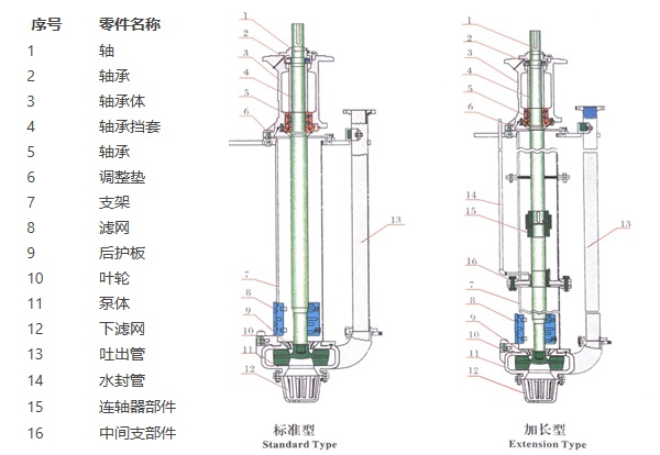 型号中含“L” 字母为加长轴系列的液下泵、可适用干液位较深的工况、这种泵在标准泵的基 础上增加了导轴承结构、运转更平稳、适用更广泛。但在导轴承部位需要附设冲洗水。