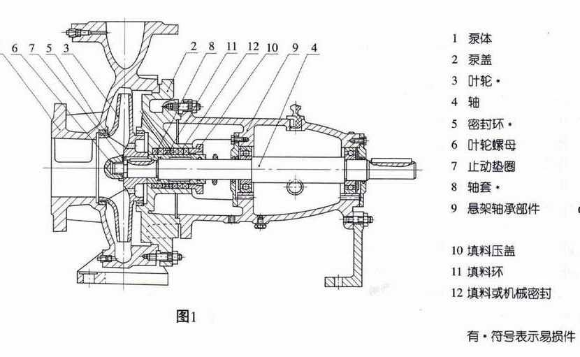 泵的壳体(即泵体和泵盖)构成泵的工作室,叶轮、轴和滚动轴承等为泵的转子。悬架轴承部件支承着泵的转子部件,滚动轴承承受泵的径向力和轴向力。